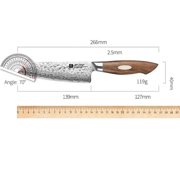 Ce couteau de chef japonais est une pièce maîtresse qui transformera votre manière de cuisiner. Forgé avec minutie à partir de 67 couches d’acier damas autour d’un noyau en AUS-10, il vous offrira une expérience de coupe d’une fluidité impressionnante. Grâce à sa lame martelée et parfaitement affûtée, vous trancherez viandes, légumes ou herbes avec une précision chirurgicale, sans effort ni résistance. L’acier utilisé assure une dureté exceptionnelle, une grande résistance à la corrosion et un tranchant durable au fil du temps.